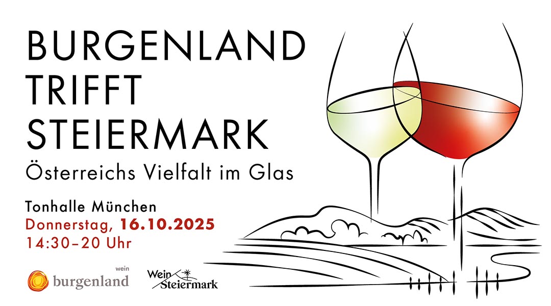 Burgenland trifft Steiermark – Österreichs Vielfalt im Glas > Homepage // 16. Oktober 2025 // TonHalle // Beginn 14:30 Uhr // VVK 19 EUR, Tageskasse 25 EUR (jeweils inkl. 2x 8 EUR Gutschein für den Weinkauf) > Tickets